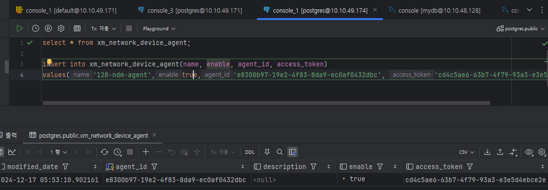 VALUES('에이전트 이름', true, 'e8300b97-19e2-4f83-8da9-ec0af0432dbc', 'uuid 토큰 값');