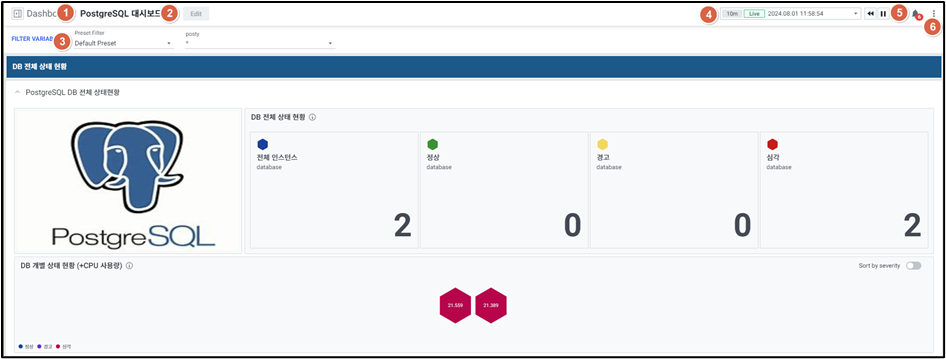 1Dashboard Name대시보드 이름. 이름 선택 시 대시보드 목록 표시. 검색/즐겨찾기(★/☆) 기능 포함