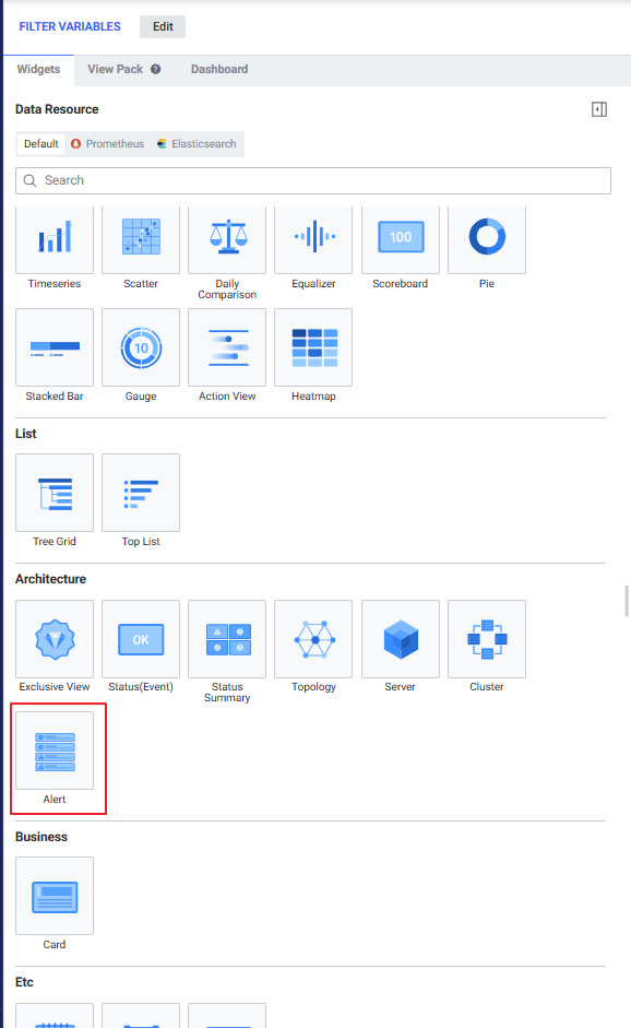 Alert 위젯 추가Dashboard > 편집 모드 > Widgets > Architecture > Alert
