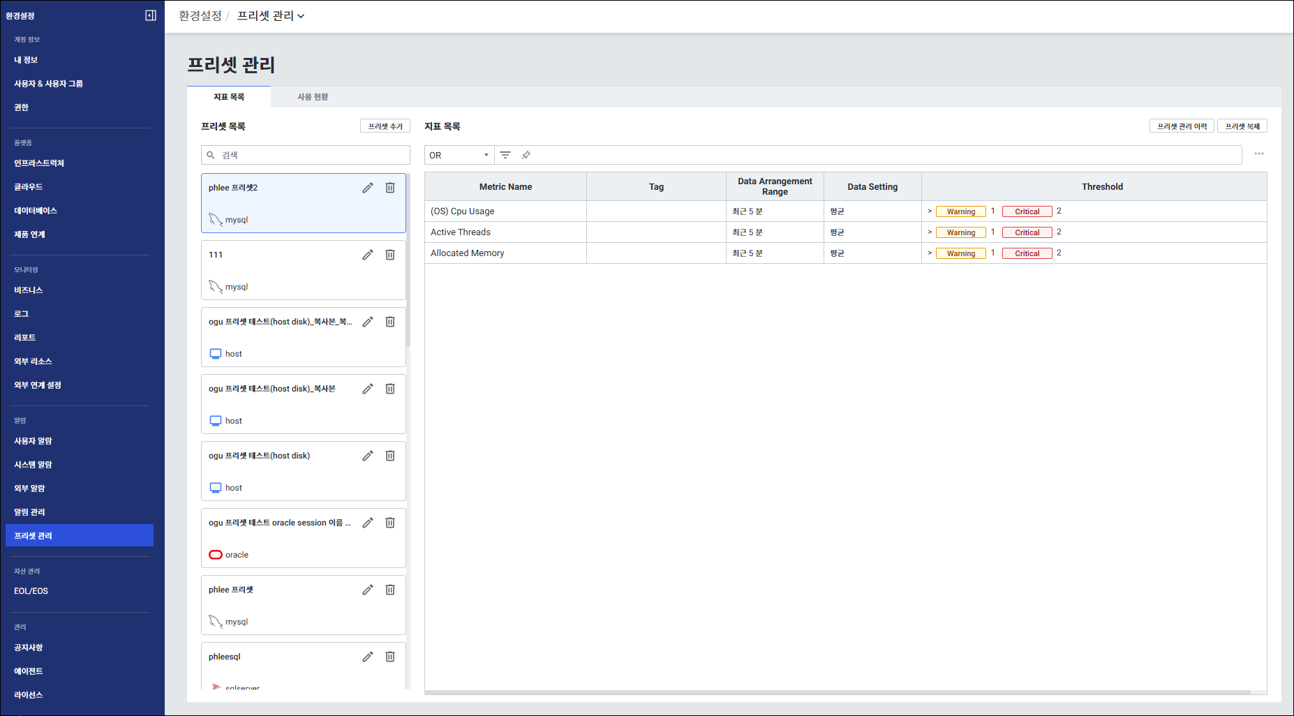 알람 프리셋 관리환경 설정 > 프리셋 관리 > 매트릭 목록