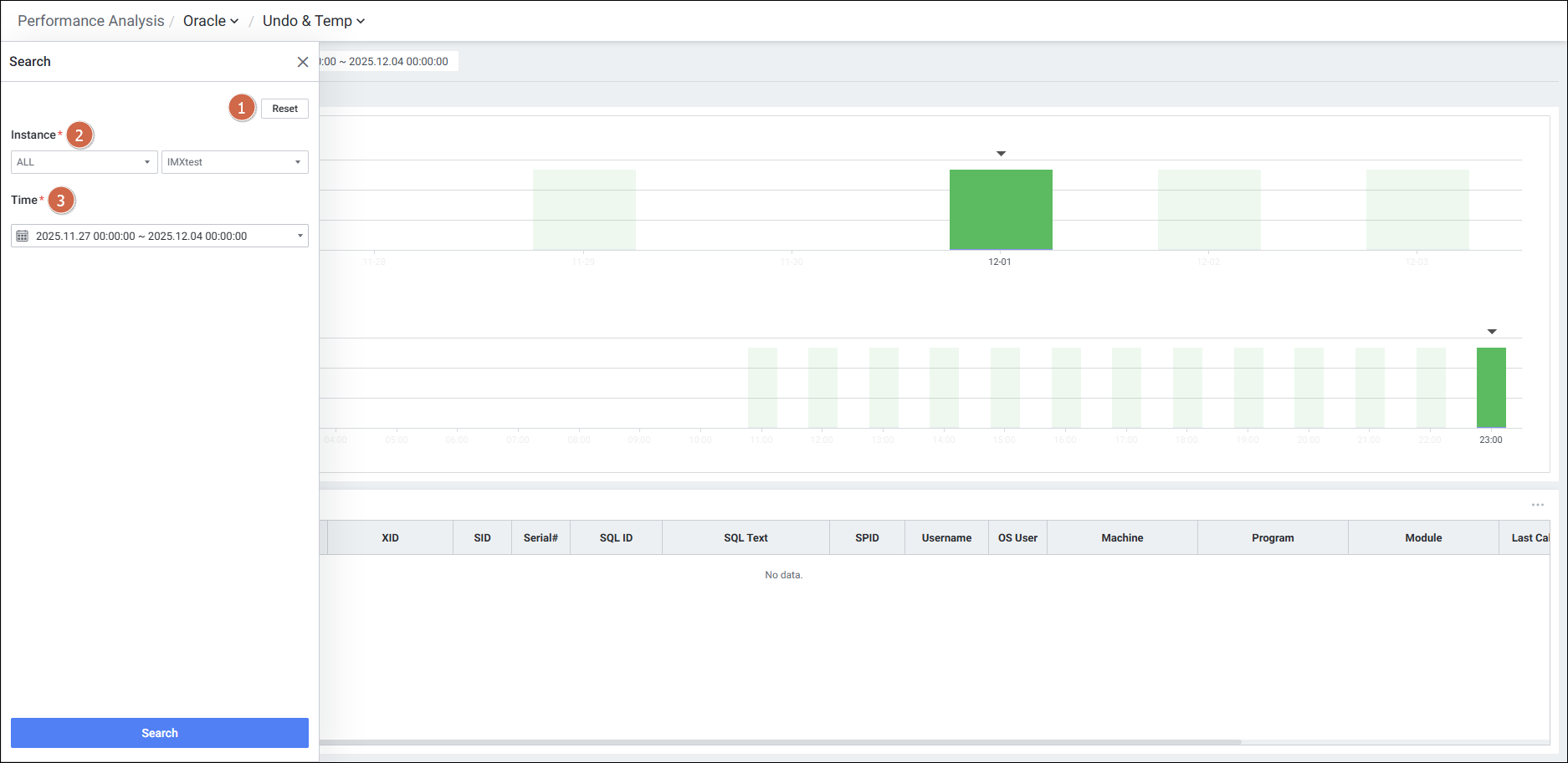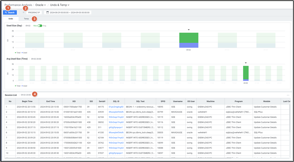 | 3 | Undo/Temp 탭 | Undo, Temp 탭을 선택하여 Session 별 사용량을 분석합니다. 선택한 탭에 따라 일자별/시간별 Undo/Temp 차트를 확인합니다. |