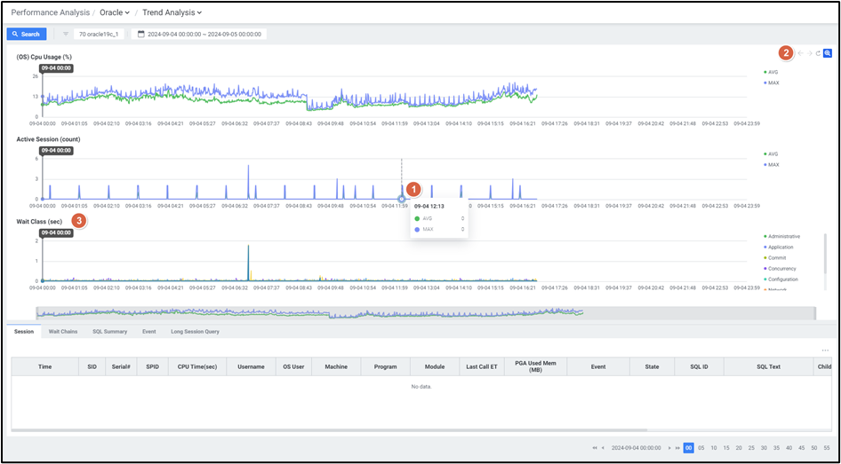 | 4 | Grid | Chart에서 클릭한 시점에 수집된 Session, Wait Summary, SQL Summary, Event, Long Session Query 정보를 보여줍니다. |