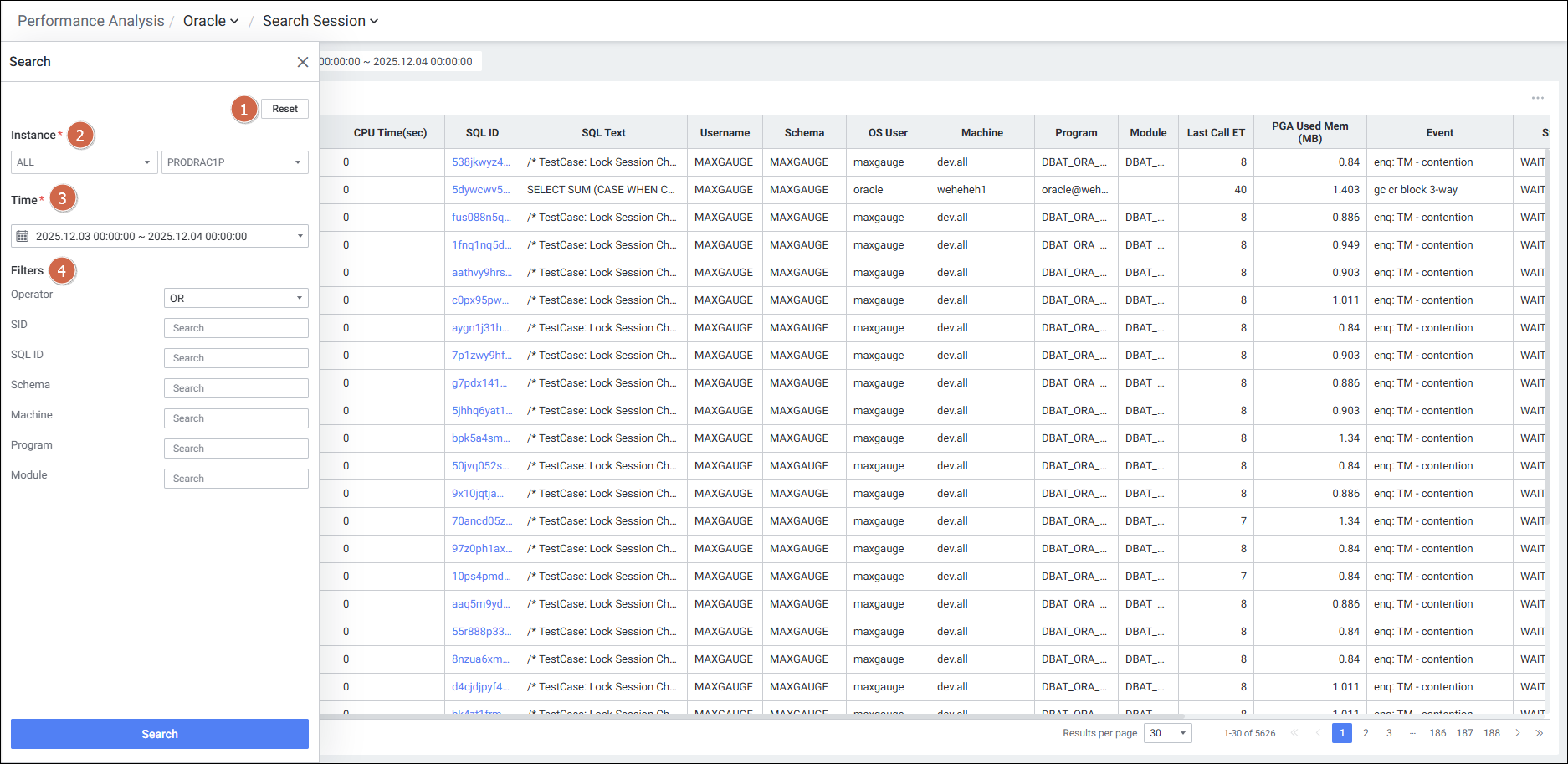 | Session Analysis | Search Session | PA > Database > Oracle > Session Analysis > Search Session |