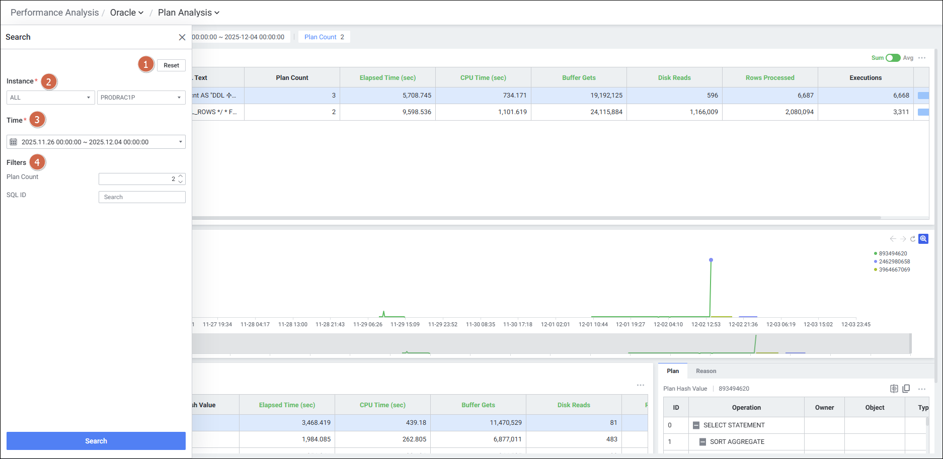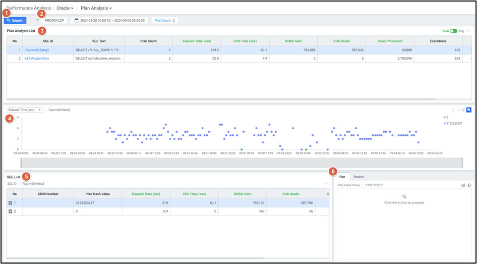 | 4 | Filters | Plan Count (숫자 입력 또는 화살표 클릭), SQL ID 입력 |