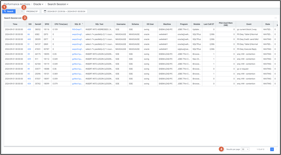 메뉴 경로: Performance Analysis > Database > Oracle > Session Analysis > Search Session