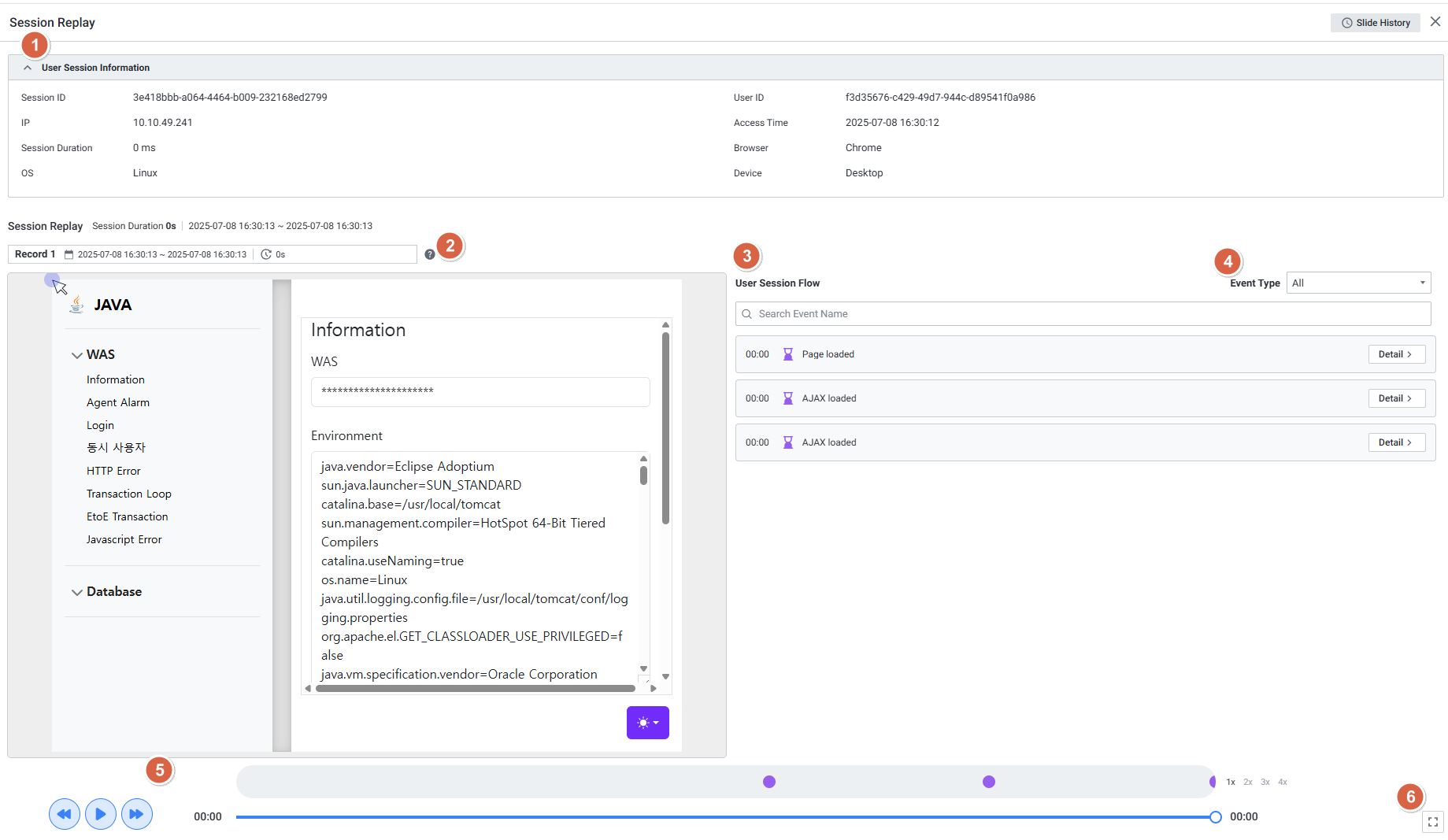 Session Replay Record관리자가 설정한 이벤트 개수 단위로 세션 분할 녹화 목록 제공. 목록 선택 시 해당 시간대 녹화 화면 출력