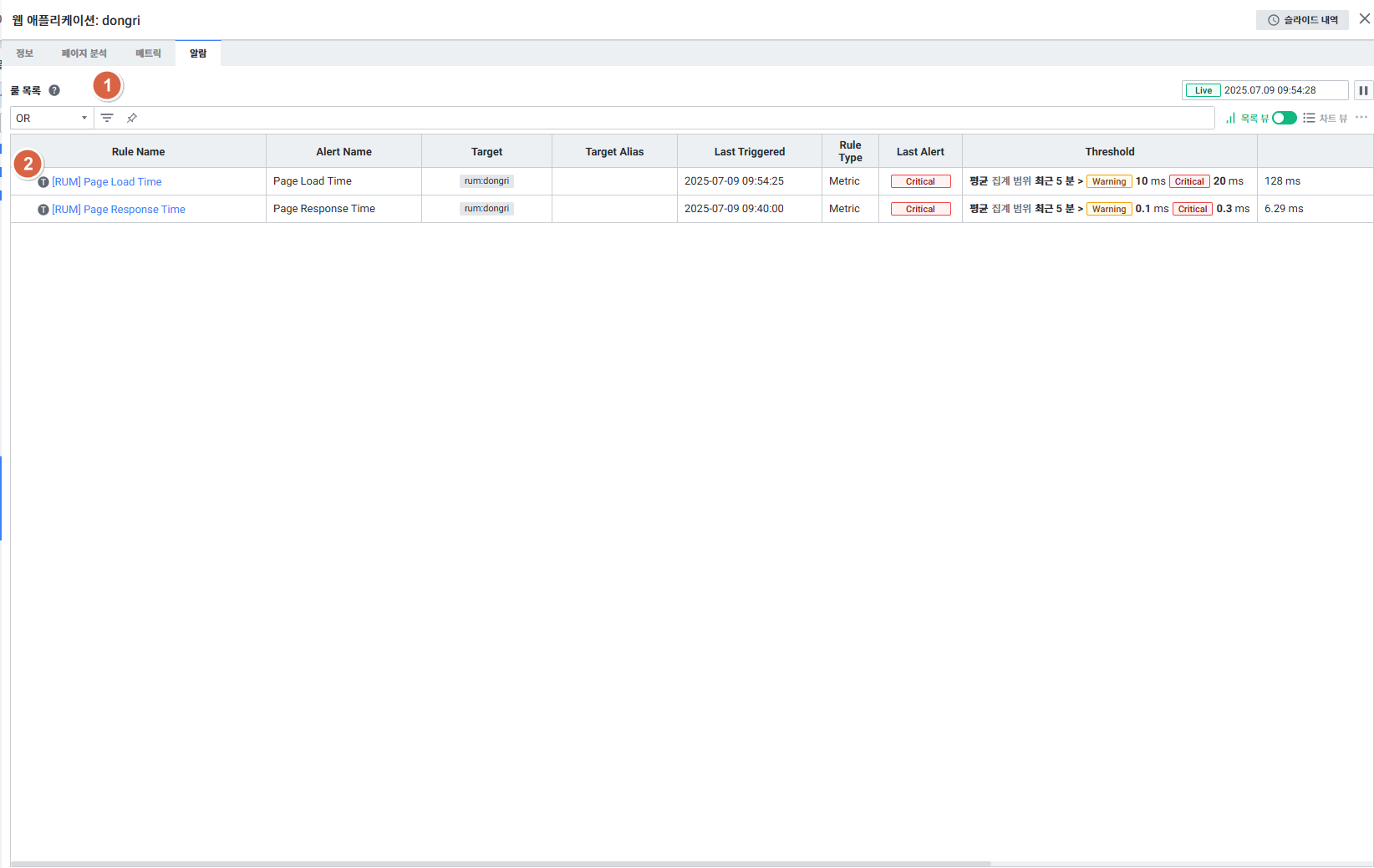 등록한 RUM 알람 정보 및 실시간 임계값을 확인할 수 있습니다.