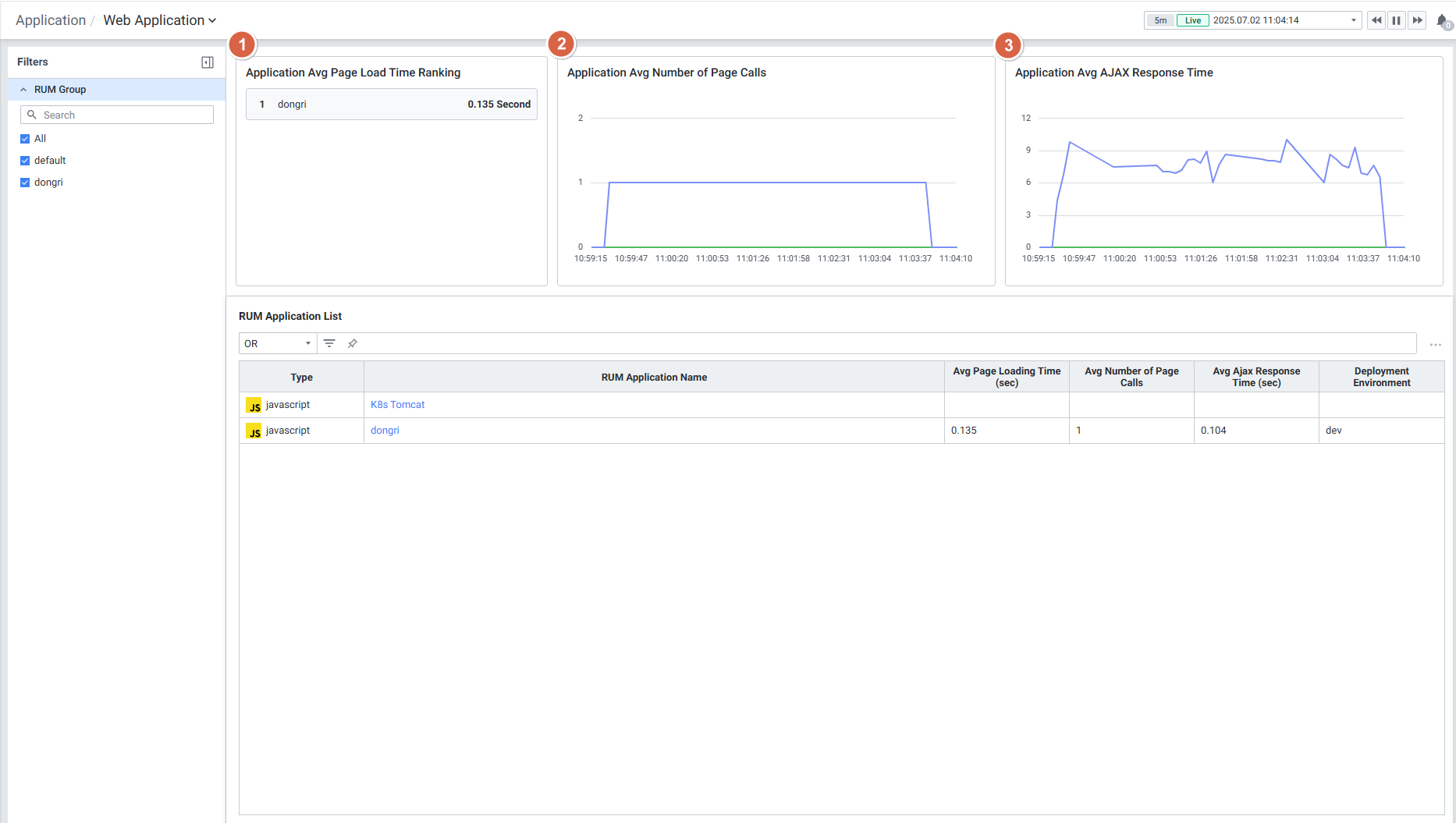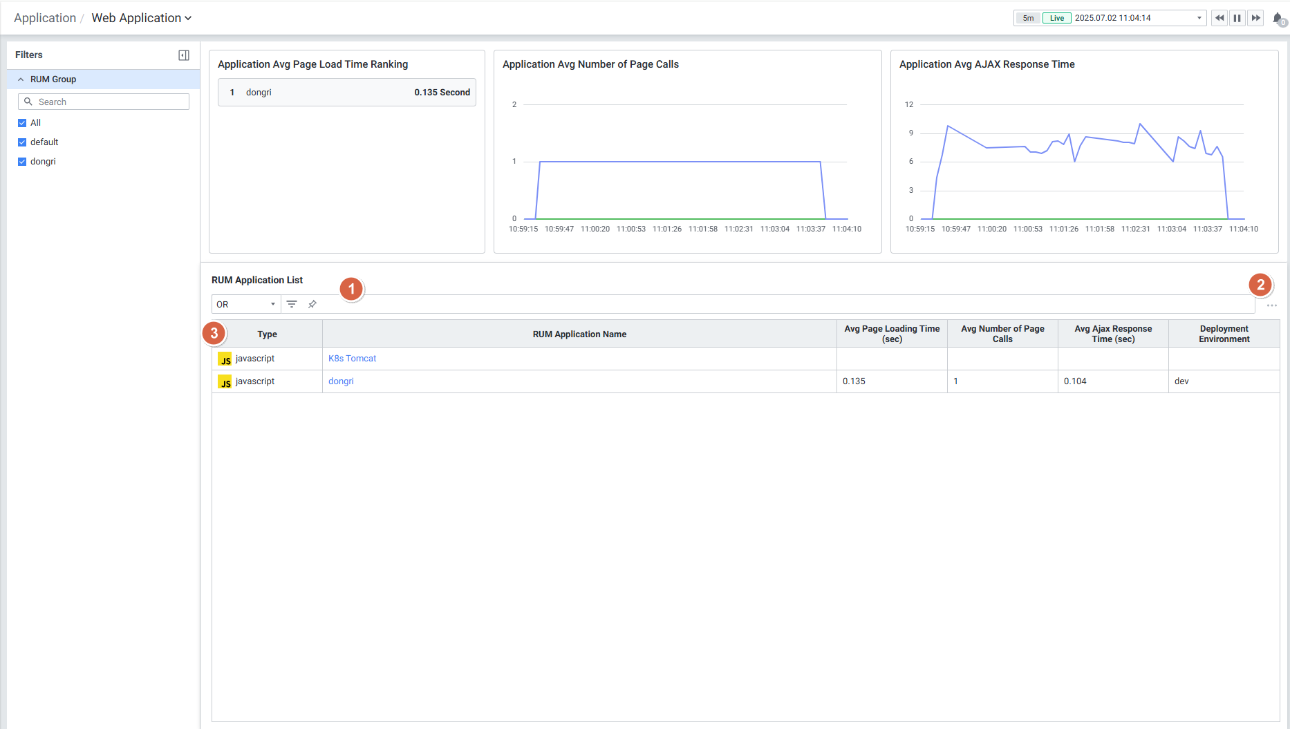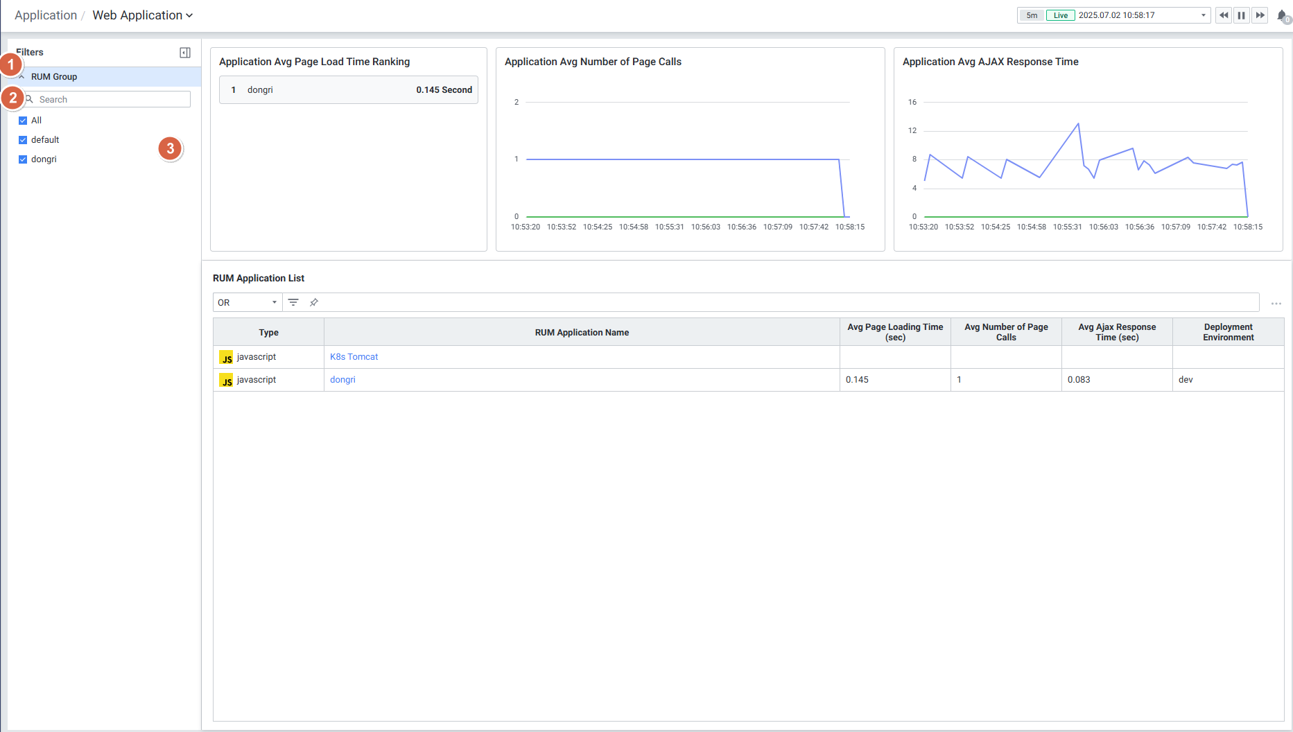 6. RUM Group 기반 필터링: 모든 RUM 하위 메뉴(Web Application, Page Performance Monitoring, User Monitoring, Browser Error Tracking)에서 RUM Group 기반 필터를 사용하여 원하는 애플리케이션만 선별적으로 모니터링할 수 있습니다.