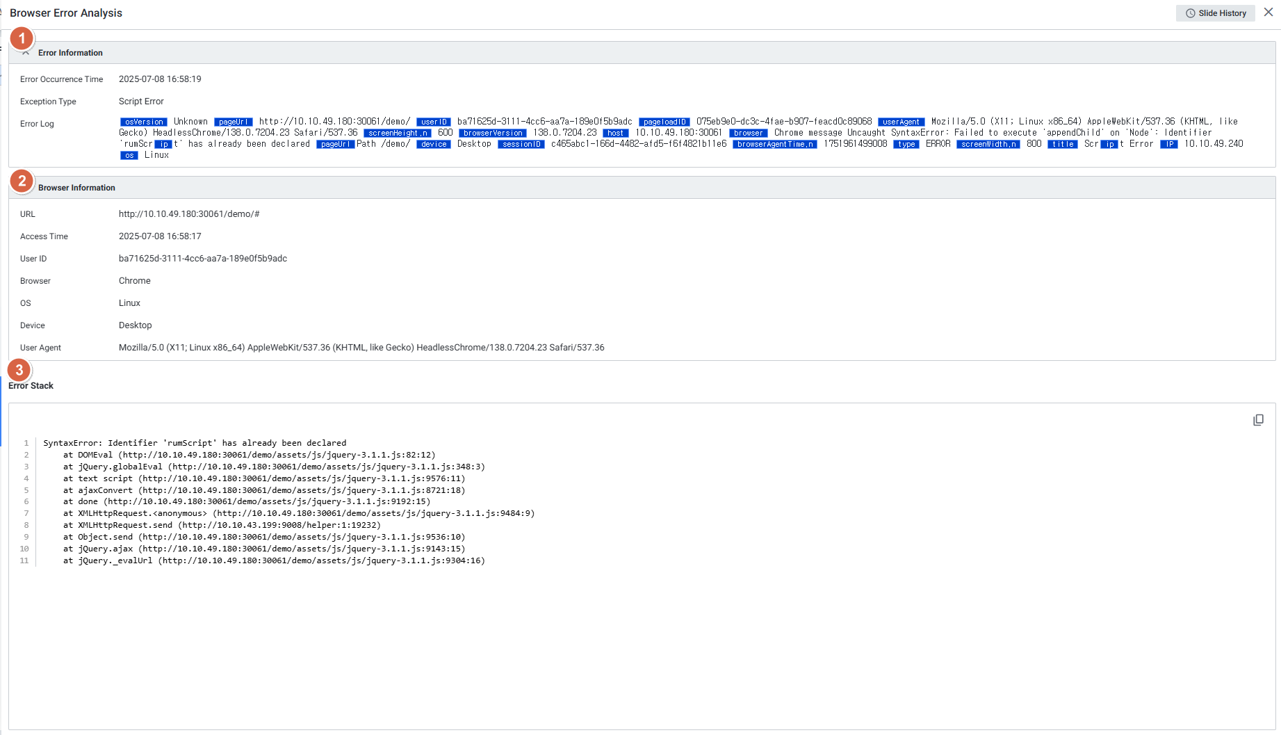 브라우저 에러 정보를 디테일 슬라이드로 제공합니다.