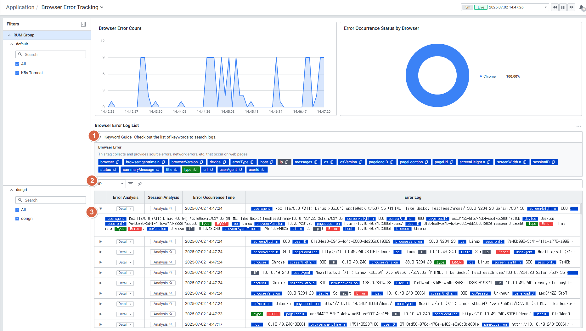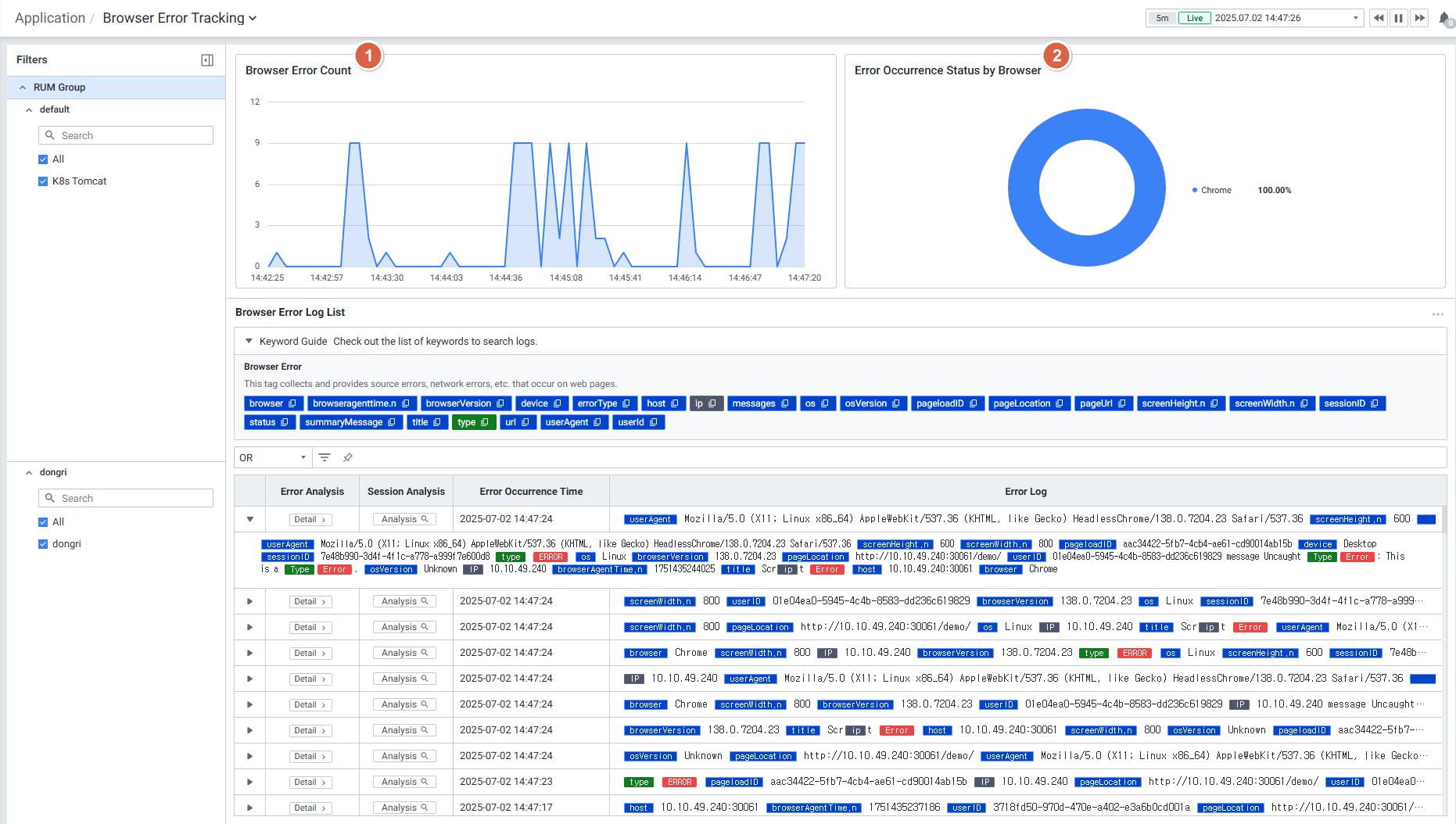 3. 에러 추적 연계: Browser Error Log에서 해당 에러가 발생한 세션의 Session Analysis로 바로 이동할 수 있어, 에러 발생 맥락을 파악할 수 있습니다.