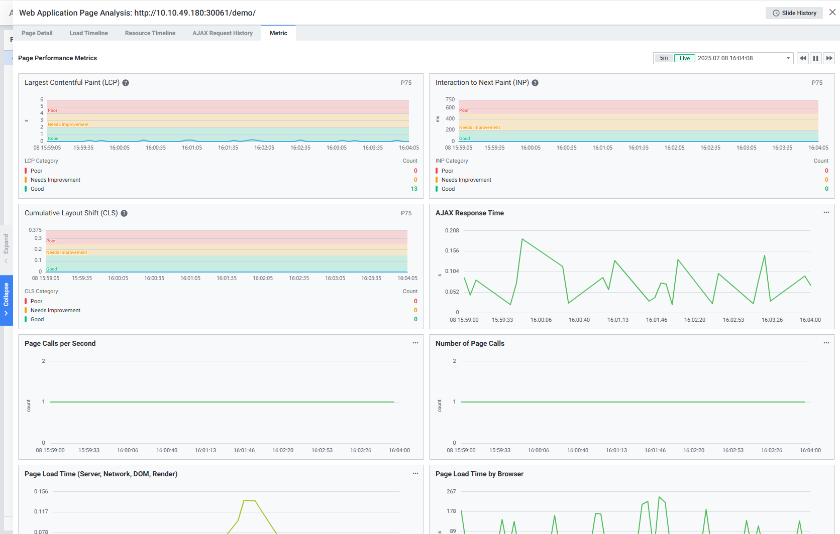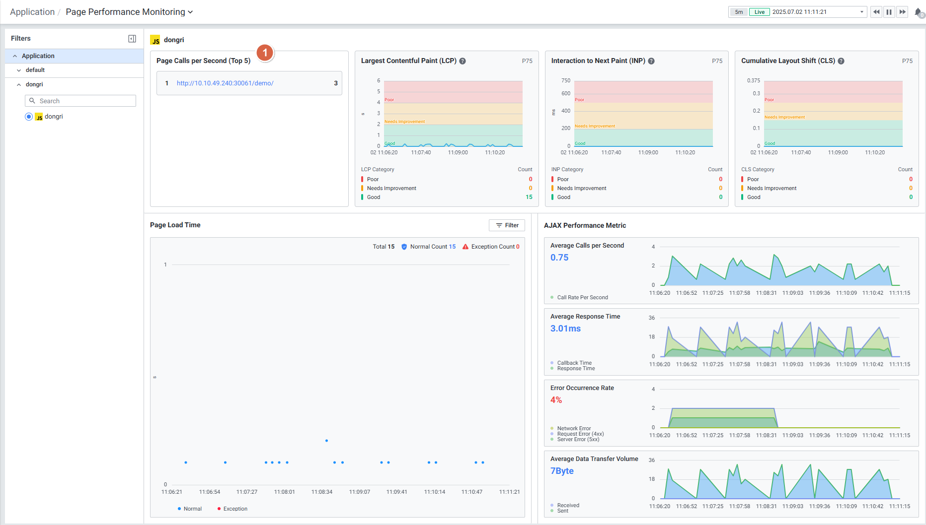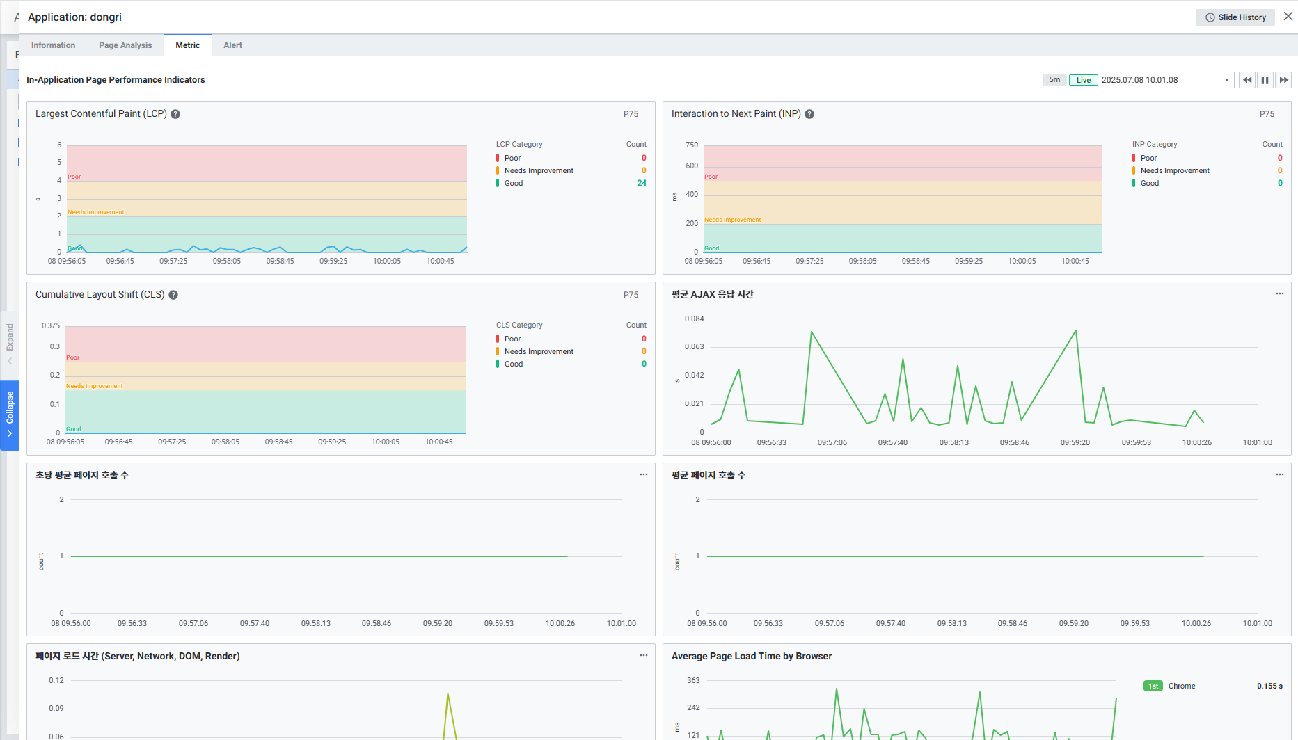 웹 애플리케이션의 항목 별 지표를 확인할 수 있습니다. Default 최근 5분 데이터를 표시합니다.