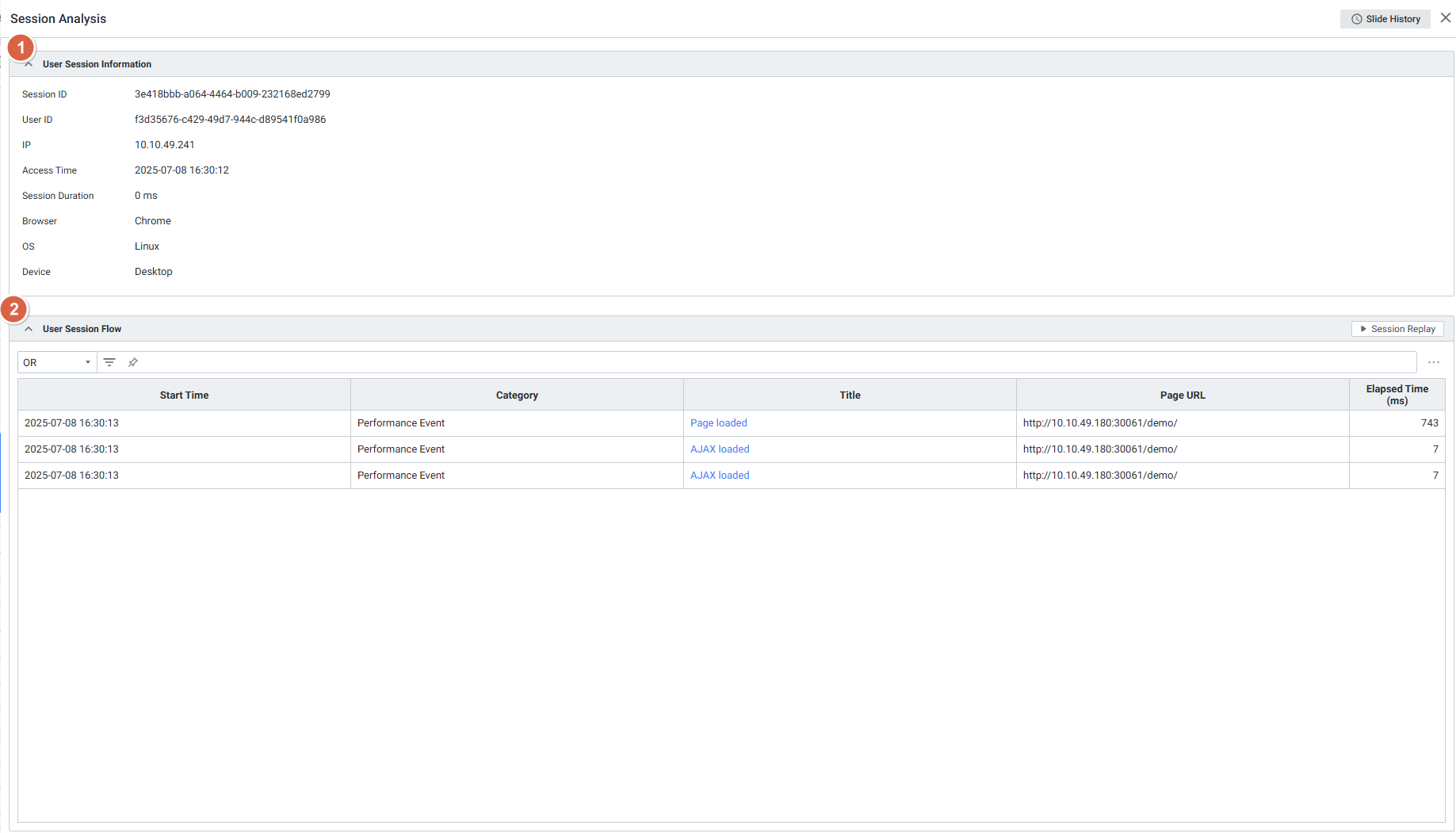 User Session Log List사용자 세션 로그 목록이 그리드 형식으로 출력. Session AnalysisSession Replay 상세 화면으로 이동 가능
