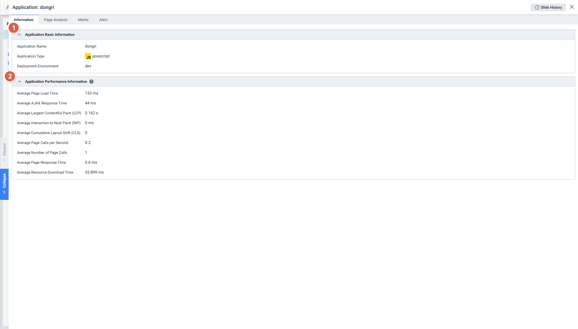 웹 애플리케이션 정보 및 페이지 호출 관련 데이터를 보여줍니다.