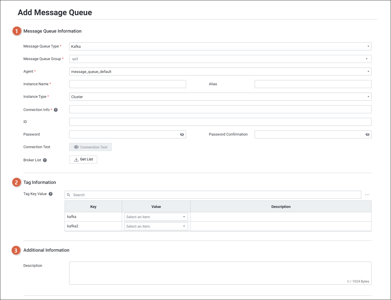 Setting > Platform > Infrastructure > Message Queue 메뉴에서 Message Queue Group 및 인스턴스를 관리합니다. 디바이스 추가 시 Instance Type으로 Cluster 또는 Cluster(Zookeeper)를 선택하고, Connection Info 설정 후 Connection Test 및 Broker List 조회가 가능합니다.