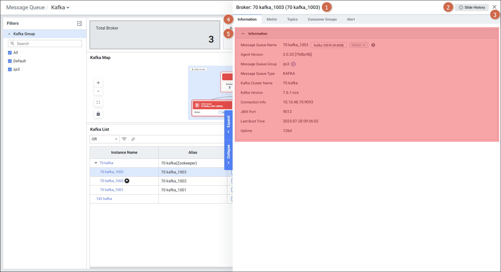 Broker Detail Slide: Information, Metric, Topics, Consumer Groups, Alert 5개 탭으로 브로커 단위 상세 정보 제공