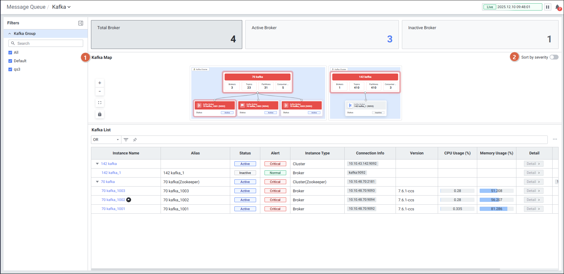 | Kafka List | Grid 형태로 Instance Name, Status, Alert, Instance Type, Connection Info, Version, CPU/Memory Usage 등 표시 |